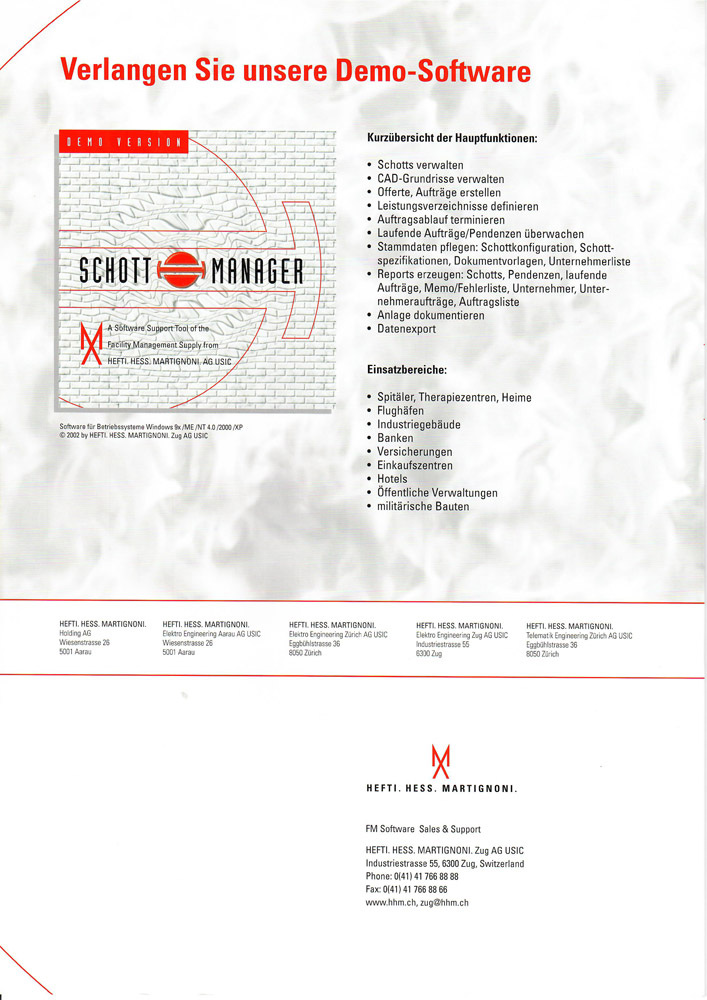 Zürich und Aarau markierten gut 40 Jahre lang die Ausgangspunkte der Unternehmens-Gruppe. 1994 kamen Zug, 2012 St. Gallen, 2013 Bern und 2014 Basel als Standorte dazu. Nahe beim Kunden, so das Credo. Es hat bis heute Gültigkeit. Auf dem Weg zur heutigen Gruppe bildete die Integration der Hugentobler Ing. HLKS GmbH in St. Gallen den vorläufigen Abschluss. Neben der physischen Präsenz wurde in die Marken-Identität und -Wahrnehmung investiert: Erste PR-Arbeiten für den Firmenauftritt schlugen 1987 mit fast CHF 40’000 zu Buche. 1998 ging die erste HHM Website online und 2001 wurden das Logo und der Schriftzug «HEFTI. HESS. MARTIGNONI.» als Marken registriert.